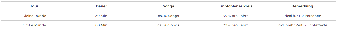 Die Songauswahl läuft über die beliebte Karaoke-App Singsta – du kannst also aus hunderten bekannten Hits deine Favoriten direkt während der Fahrt auswählen. Ob 80er-Klassiker, 90er-Hymnen oder aktuelle Chartbreaker – bei uns wird jeder zum Superstar!